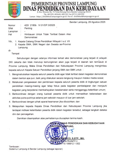 MENTARI NEWS— Di tengah derasnya gelombang aksi massa yang terjadi di Jakarta hingga Surakarta pada Jumat, 29 Agustus 2025, Provinsi Lampung menimbulkan perhatian tersendiri. Kepala Dinas Pendidikan dan Kebudayaan (Disdikbud) Provinsi Lampung, Thomar Amirico, mengedarkan surat imbauan yang menegaskan larangan bagi seluruh peserta didik untuk ikut serta dalam aksi demonstrasi.