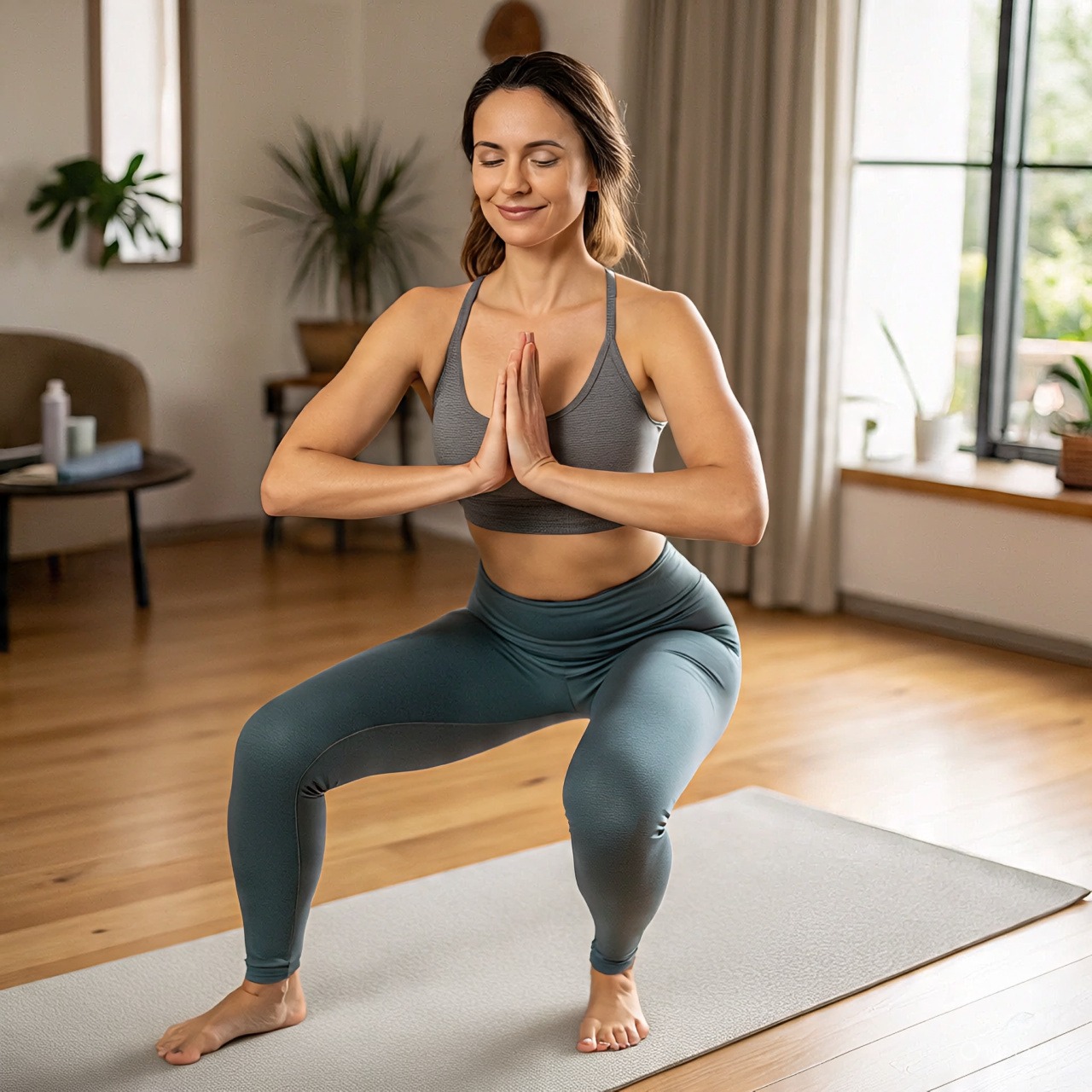 Latihan ini melatih otot kaki dan pinggul. Berdiri dengan kaki selebar bahu, lalu turunkan tubuh seperti duduk di kursi, tahan sebentar, dan kembali berdiri.