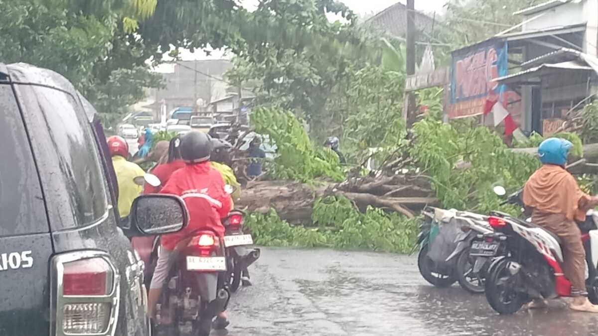 MENTARI NEWS– Hujan deras disertai angin kencang siang ini membuat jalur utama menuju kawasan wisata Pesisir Pesawaran lumpuh total. Sebuah pohon besar tumbang dan menutupi seluruh badan Jalan RE Martadinata, Kelurahan Way Tataan, Telukbetung Timur, sejak pukul 11.45 WIB, Selasa 7 Oktober 2025. Akibatnya, arus lalu lintas dari arah Bandar Lampung menuju wilayah wisata di pesisir selatan itu benar-benar terhenti.
